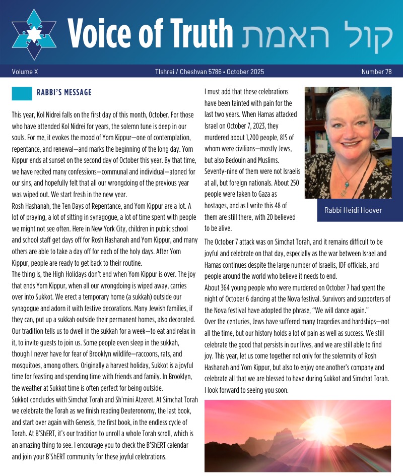 Accessibility: We would like to do our best to welcome and accommodate all. Our building is not fully physically accessible for wheelchair users or those who cannot navigate stairs, but there is a ramp to the outside door, and the sanctuary, community room, and ground floor restrooms are accessible. Please call the temple office at 718-282-1596 or email office@bshert.org with any questions about accessibility.
